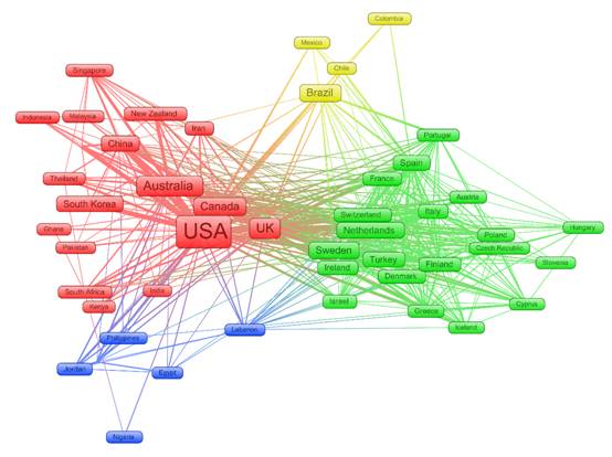 图2描述了发文量排名前60的国家/地区合作网络,图中节点表示国家/地区,节点大小表示论文产量,颜色表示聚类,同一聚类的国家/地区合作紧密。USA、UK、Canada和Australia四个国家之间合作紧密,并且处于网络的中心。从网络聚类来看,红色聚类的国家/地区分别来自美洲、欧洲、亚洲等不同的洲,而其他聚类中的国家/地区主要来自同一个洲,并且地理距离比较接近。在合作网络中美国和加拿大合作596次、其次是英国和澳大利亚的590次。