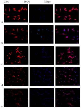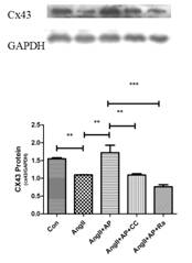 因此,本课题建立AngII诱导的HL-1细胞模型,探究AngII诱导HL-1细胞模型Cx43下调的最适浓度(10uM)和Apelin-13干预的最适浓度(100nM)。实验结果发现,单独使用AngII处理HL-1细胞,Cx43表达明显下降,单独使用Apelin-13对Cx43表达无明显影响,但Apelin-13和AngII合用时,Apelin-13可以明显改善AngII诱导的Cx43表达(图1)。