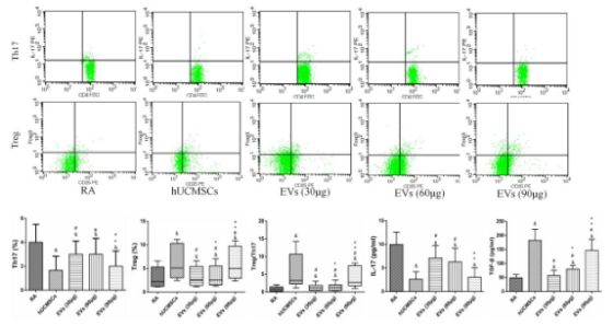 3. MSCs在静息或应激状态下释放的细胞外囊泡(EVs)可模拟MSCs的免疫调节及组织修复作用,并且规避MSCs作为细胞治疗带来的一些风险。本研究在体外实验中研究了hUCMSCs对RA患者T细胞的免疫调节作用,并将hUCMSCs与hUCMSC-EVs的免疫调节作用进行了比较,结果显示hUCMSCs和hUCMSC-EVs均可下调RA患者外周血Th17细胞比例,抑制IL-17分泌,上调Treg细胞比例和Treg/Th17,促进TGF-β的表达;在降低Th17细胞比例和IL-17A水平方面hUCMSCs和hUCMSC-EVs(90μg)作用相似,在增加Treg细胞比例、Treg/Th17和TGF-β水平方面hUCMSCs作用优于hUCMSCs(90μg)。