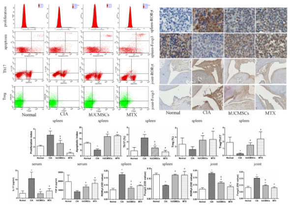 2. hUCMSCs抑制CIA大鼠脾脏T细胞增殖,促进T细胞凋亡,降低Th17细胞比例,上调Treg细胞比例,恢复Treg/Th17平衡;抑制血清IL-17表达,促进血清TGF-β表达;其中hUCMSCs抑制T细胞增殖、下调Th17细胞比例作用略弱于MTX,促进T细胞凋亡、上调Treg细胞比例及Treg/Th17,抑制IL-17表达,促进TGF-β表达作用与MTX相似。免疫组化及RT-PCR方法证实hUCMSCs下调CIA大鼠脾脏ROR-γt及ROR-γt mRNA表达,作用优于MTX;上调脾脏Foxp3及Foxp3mRNA表达,作用与MTX相似。此外,免疫组化方法证实hUCMSCs下调CIA大鼠关节ROR-γt及Foxp3表达。