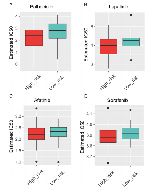 图3 不同风险预后组之间化疗的IC50估计值。在低风险组中,通过“pRRophetic”算法获得的三种靶向药物的IC50值明显较高。A:帕博西尼。B:拉帕替尼。C:阿法替尼。D:索拉非尼。