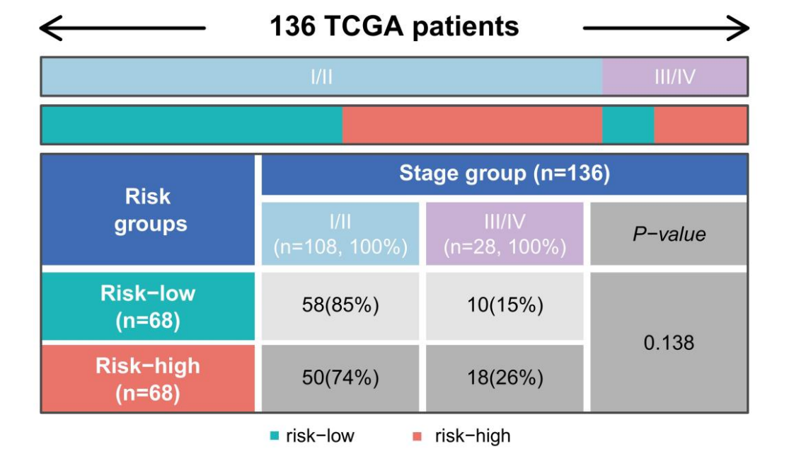 进行肿瘤分期与糖酵解风险相关性的分析(图1),本研究发现肿瘤分期与糖酵解风险评分之间没有明显的相关性,这表明糖酵解和预后相关(GRP)特征适用于TNBC的所有阶段。