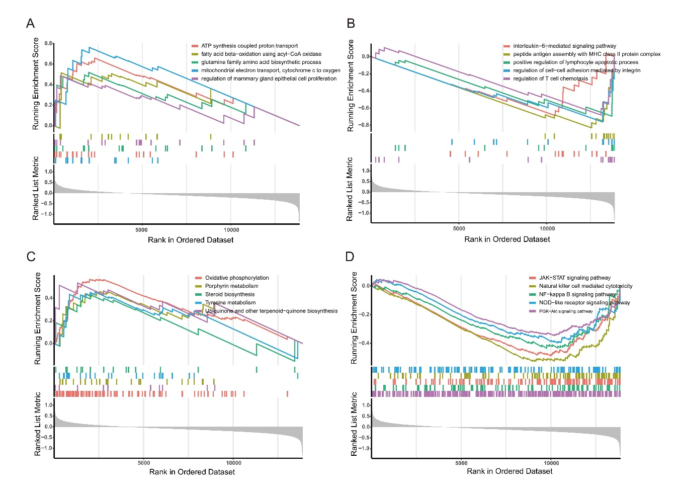 对癌症基因组图谱(TCGA)队列进行基因集合富集分析(GSEA)检测,本研究发现高风险组的基因主要富集于代谢相关途径中,其中最丰富的途径是“氧化磷酸化”(图2A、图2C);而低风险组的基因主要富集于免疫/炎症相关途径中(图2B、图2D)。