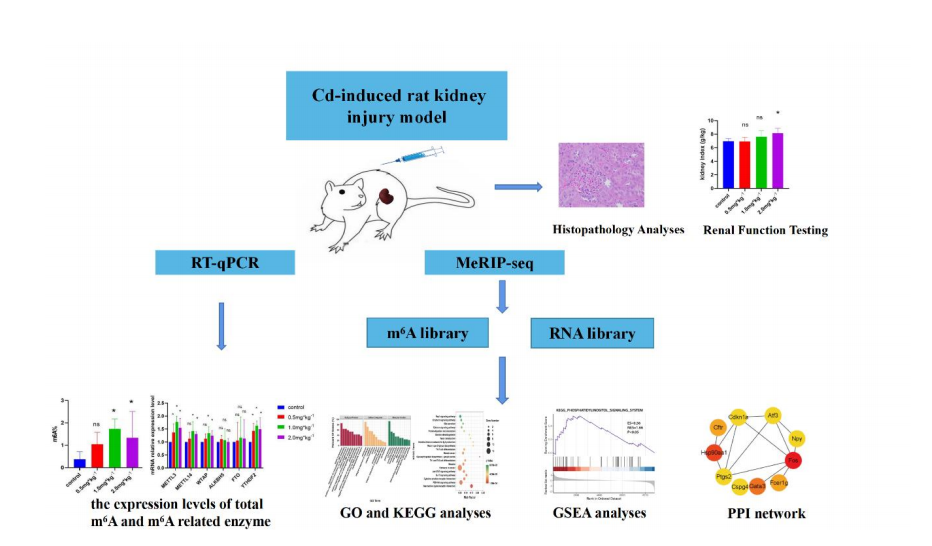 该研究基于人群研究发现的重金属镉(Cd)暴露致肾功能 损伤的基础,为了揭示镉对肾脏的毒作用机制,构建了镉致肾 损伤大鼠模型,通过高通量测序及生物信息学分析,揭示了镉 致大鼠肾损伤中 N6-甲基腺苷(m 6A)的修饰图谱及该过程中可能涉及的通路和基因,认为 m 6A 修饰可能通过调控炎症和代谢 相关通路参与氯化镉诱导肾损伤过程,从 m 6A 修饰角度为镉致 肾损伤机制研究提供了新的思路。