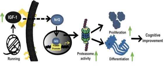 运动锻炼可以有效改善认知功能,但学术界目前对其机制阐释不全面。海马是人类及脊椎动物大脑的重要组成部分,也是成年后神经发生的主要部位,新生神经元参与学习、记忆、空间定位以及压力、情绪调控。研究论文首次揭示了自主运动可通过提高小鼠血清和海马IGF-1水平,触发转录因子Nrf2核转位,激活蛋白酶体核心亚单位PSMB5转录表达,增强海马蛋白酶体活性,进而促进海马齿状回下区神经发生,改善小鼠的学习记忆能力。此研究工作进一步解释了蛋白酶体改善学习认知能力的新机制,为延缓脑老化,以及应用运动干预认知障碍提供了重要依据。该研究成果也是陆利教授团队在蛋白酶体活性与细胞功能调控领域长期潜心研究取得的新突破。该研究工作得到了国家自然科学基金和山西省归国留学基金的资助。