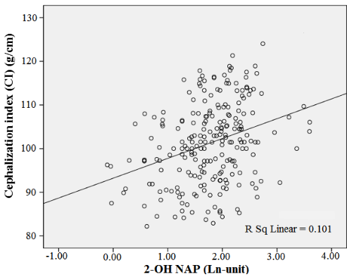 图一.孕妇尿中2-OHNAP与新生儿CI指数之间关系的散点图