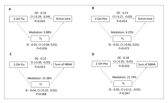 公共卫生学院劳动卫生教研室聂继盛团队在太原市先后建立5个出生队列,用分子流行病学探究孕期多环芳烃对于子代神经和体格发育的影响,以及可行的分子标志物。本研究主要发现包括1)孕妇尿中2-羟基菲与新生儿神经行为发育指标负相关,主要包括主动肌张力和总神经行为评分。2)2-羟基菲与新生儿脐血DNA端粒长度负相关。3)脐血DNA端粒长度与新生儿神经行为发育指标正相关,中介分析表明,孕妇尿中2-羟基菲对于新生儿神经发育评分的影响,可以由DNA端粒长度的改变来解释,其可以解释21.74%。该研究结果提示:脐血DNA端粒长度的改变可以用来部分的预测多环芳烃对于新生儿神经行为的效应,端粒长度可能是一个可行的用于预测神经发育的分子标志物。
