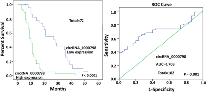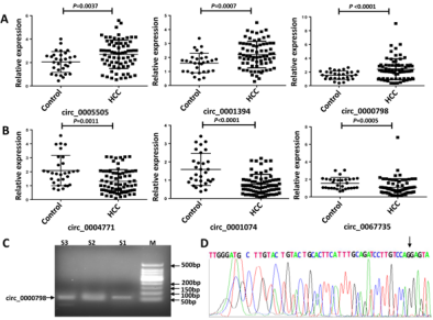 本研究首先通过高通量RNA-seq技术,深度分析HCC特异差异表达的候选RNA分子,经扩大样本RT-PCR验证筛选出HCC特异高表达的circ_0000798。经Sanger测序验证及统计分析证明circ_0000798与HCC肝硬化,肿瘤大小等显著正相关,与患者生存时间显著负相关,ROC曲线表明该分子可作为HCC早期诊断的标记物(相关成果已申请发明专利,实质审查阶段)。