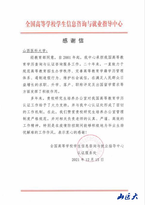 日前,我校研究生学院收到来自全国高等学校学生信息咨询与就业指导中心的感谢函。信函对研究生学院在高等教育学历认证工作中给予的支持表示衷心感谢。